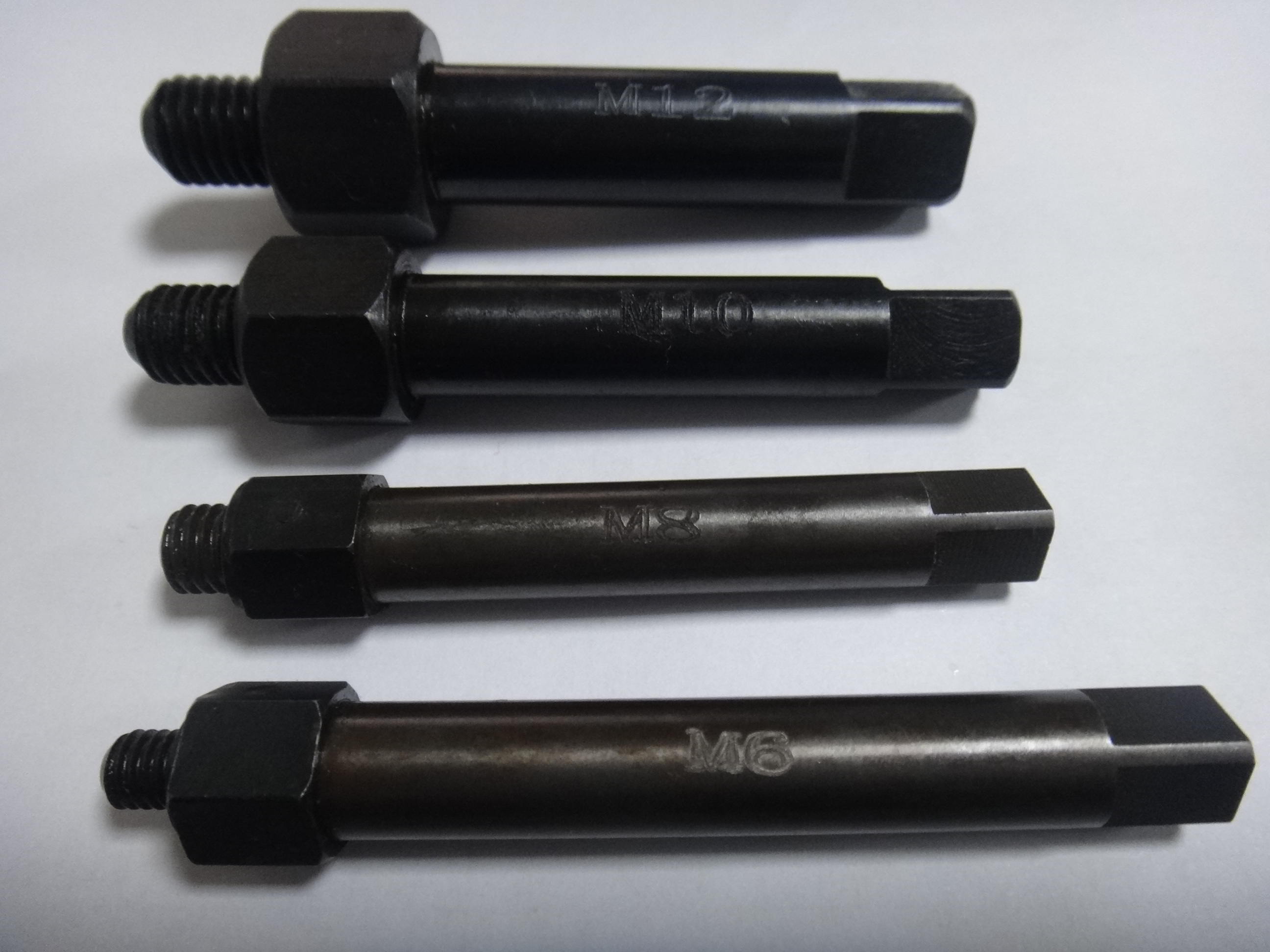 對有折斷槽的鋼絲螺套,旋入螺孔后應將安裝柄去除,需用去柄工具。通孔時,要將鋼絲螺套安裝柄折斷,一般用沖斷器對準安裝柄,用 200g 左右的榔頭猛打一下即可去除,對于 M18×2.5 以上的粗牙鋼絲螺套和 M14×1.25 以上的細牙鋼絲螺套 , 用尖嘴鉗上下彎曲安裝柄就能折斷,然后將斷下來的安裝柄從螺孔中取出即可。