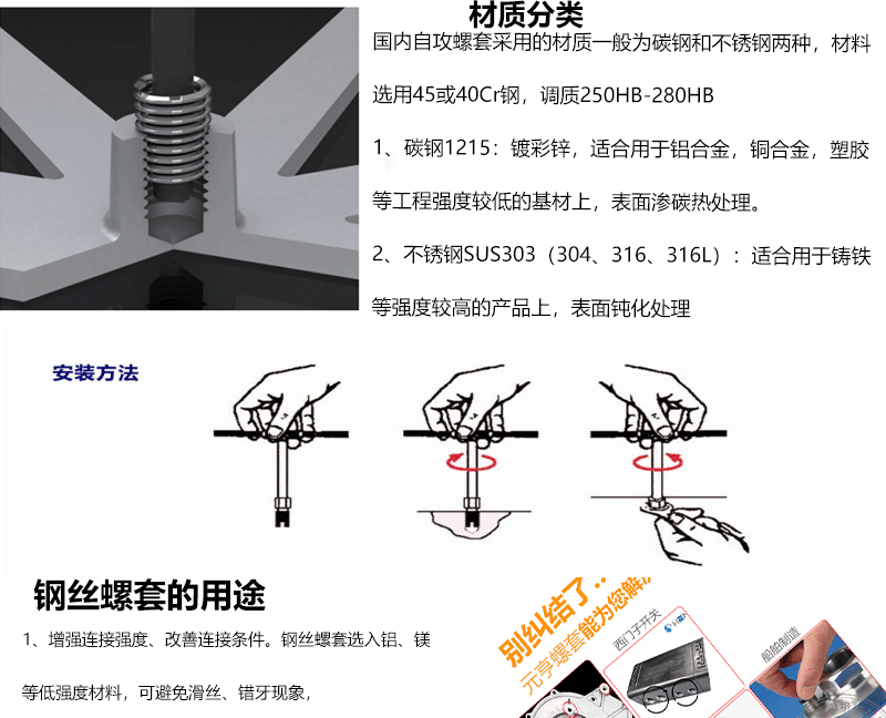 簡易螺紋護套安裝工具有螺紋頭、光桿兩種。用于少量安裝,一般維修、實驗時用,操作時不易安裝,鋼絲螺套容易報廢。