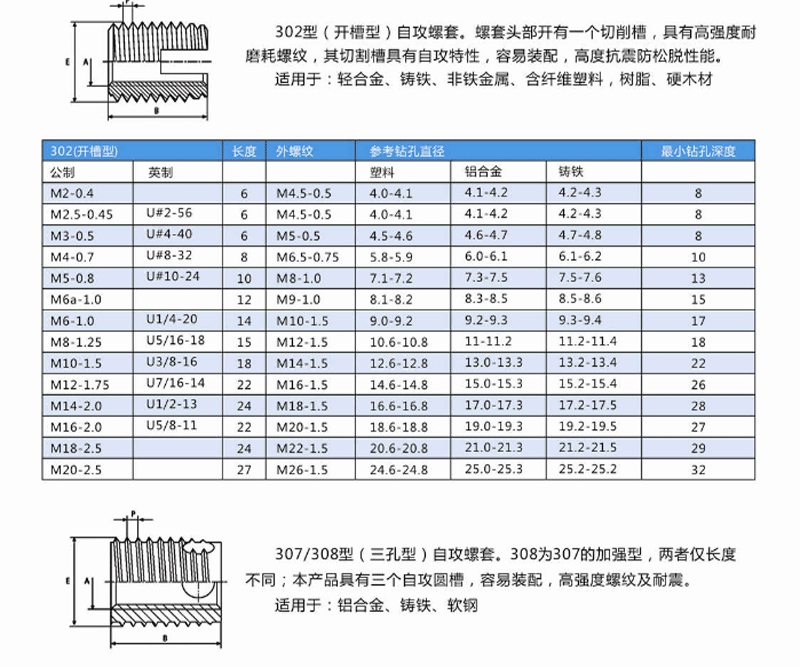 可根據用戶需要設計、制造各種特殊品種的螺紋底孔絲錐,例如在軟鋁,紫銅上攻絲的機用、手用擠壓絲錐,單支普通鋼攻絲的專用機用絲錐、不銹鋼攻絲絲錐、用于盲孔的平底絲錐、螺旋槽絲錐、螺尖絲錐等。鋼絲螺套絲錐、螺紋護套絲錐的選擇