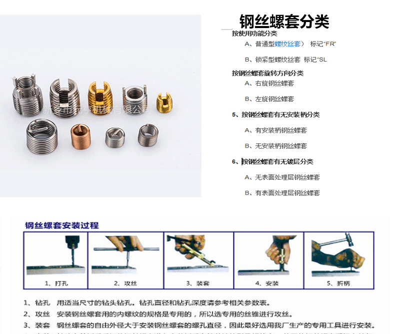 鋼絲螺套在安裝后,一般通孔都要求將尾柄去除掉,具體方法是用沖斷器對(duì)準(zhǔn)安裝柄,用200g的榔頭猛打一下,即可去除,對(duì)于18X2.5以上的粗牙絲套和14X1.25以上的細(xì)牙絲套,用尖嘴鉗上下彎曲安裝柄就能折斷。