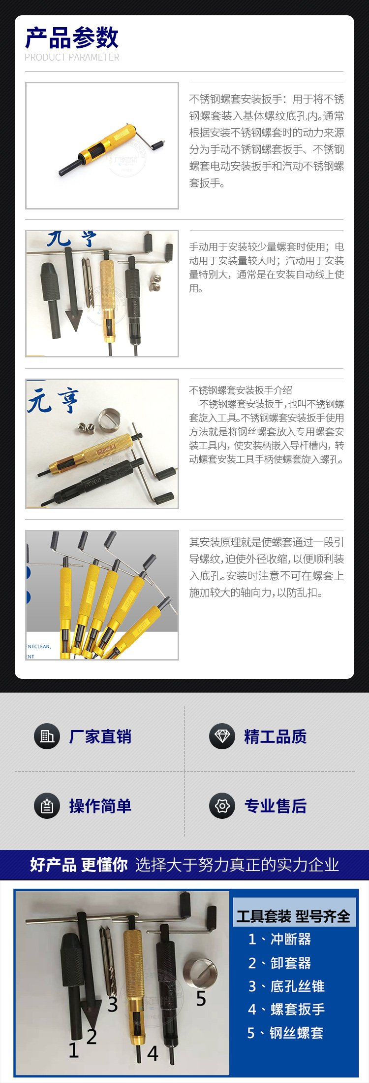 簡易螺紋護(hù)套安裝工具有螺紋頭、光桿兩種。用于少量安裝,一般維修、實(shí)驗(yàn)時用,操作時不易安裝,鋼絲螺套容易報(bào)廢。
