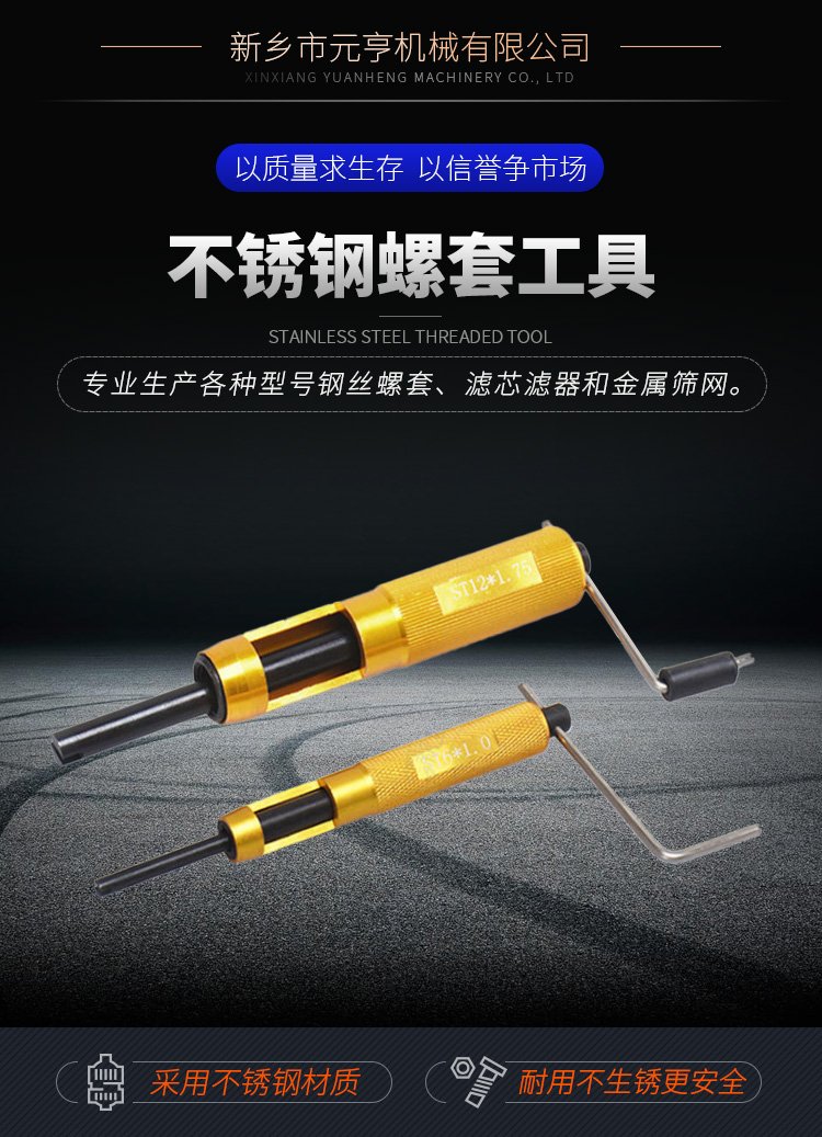 簡易螺紋護套安裝工具有螺紋頭、光桿兩種。用于少量安裝,一般維修、實驗時用,操作時不易安裝,鋼絲螺套容易報廢。