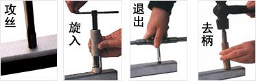 對(duì)有折斷槽的鋼絲螺套,旋入螺孔后應(yīng)將安裝柄去除,需用去柄工具。通孔時(shí) , 要將鋼絲螺套安裝柄折斷 , 一般用沖斷器對(duì)準(zhǔn)安裝柄 , 用 200g 左右的榔頭猛打一下即可去除 , 對(duì)于 M18×2.5 以上的粗牙鋼絲螺套和 M14×1.25 以上的細(xì)牙鋼絲螺套 , 用尖嘴鉗上下彎曲安裝柄就能折斷,然后將斷下來(lái)的安裝柄從螺孔中取出即可。
